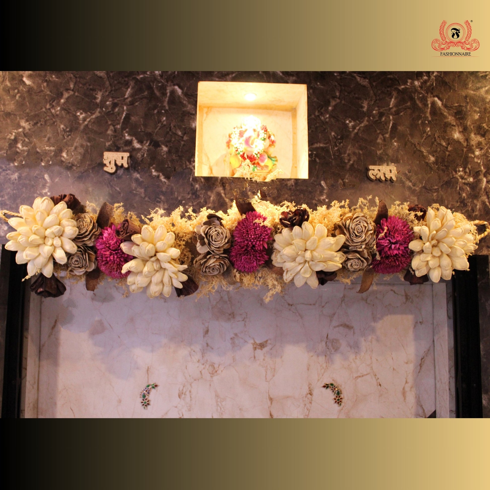 Ensuring a perfect match for every aesthetic, we showcase one of our hot selling Torans, made with a combination of Corn Peel flowers, Sola wood flowers, natural dried botanicals and best intentions. Providing enduring beauty and value, these torans don't require constant maintenance and are easy to install. Add a distinctive and natural touch to your home, setting it apart with a unique and elegant statement piece. Let's spread the beauty of our culture and traditions with this toran. Gift this to your loved ones and help them invite blessings and abundance into their homes.