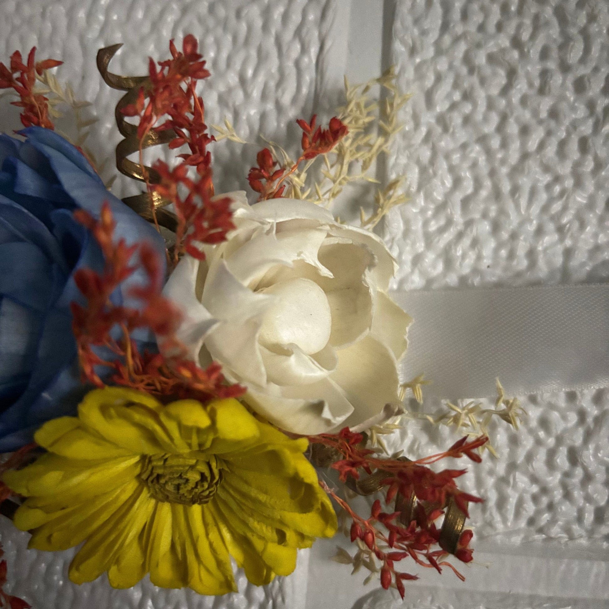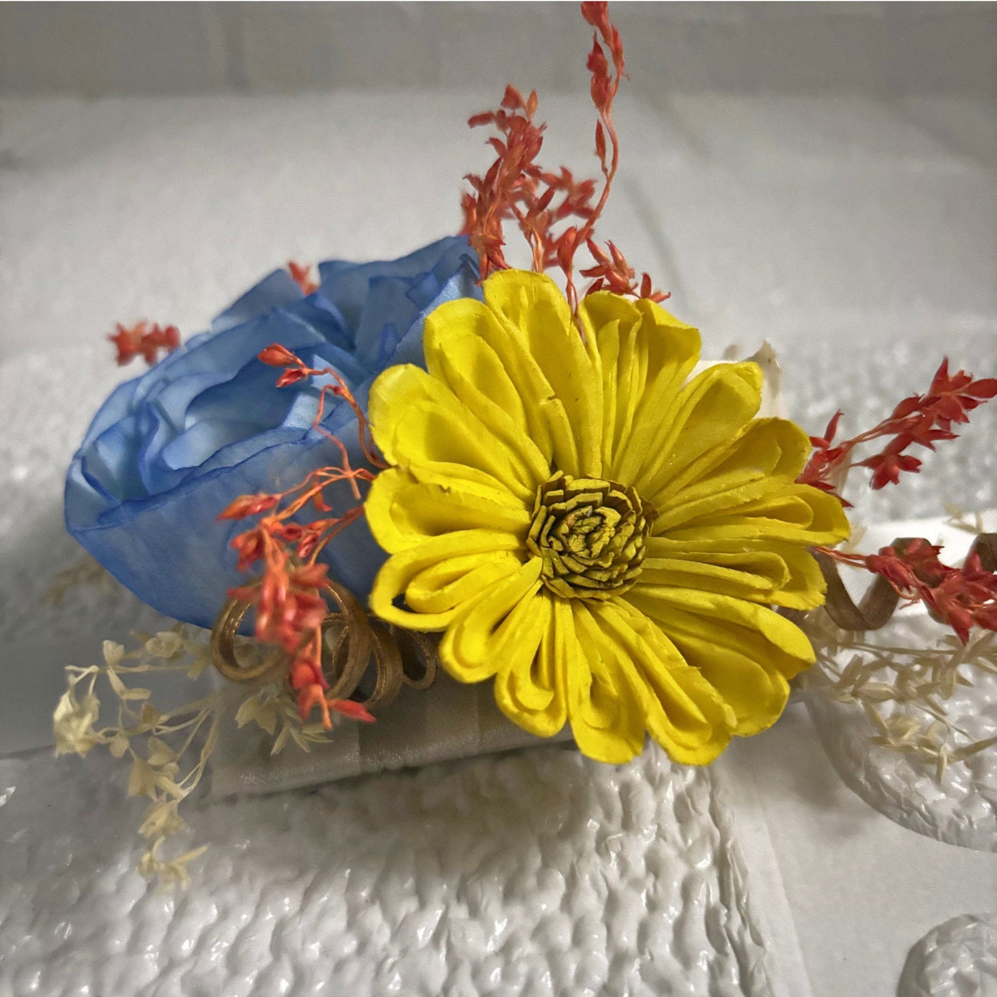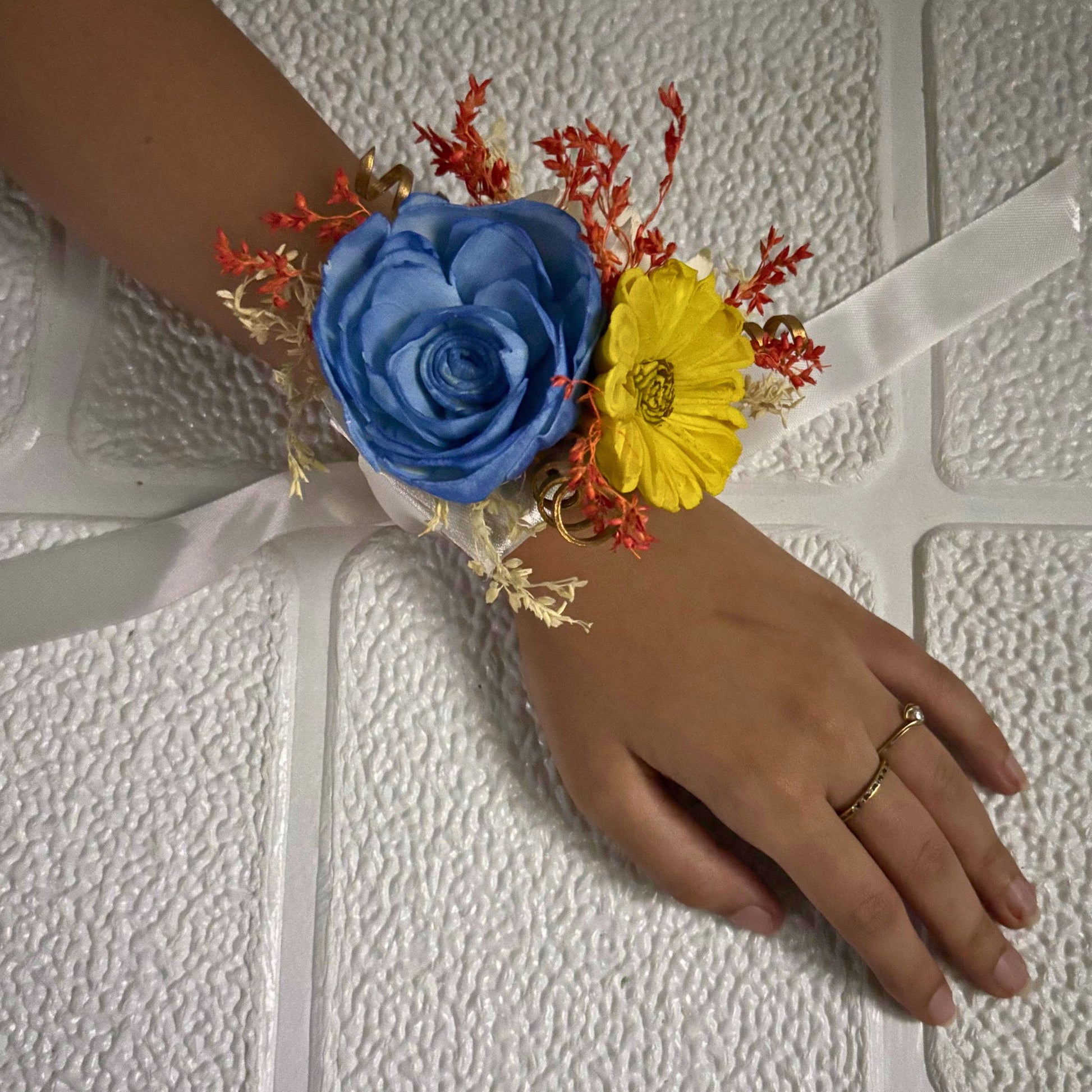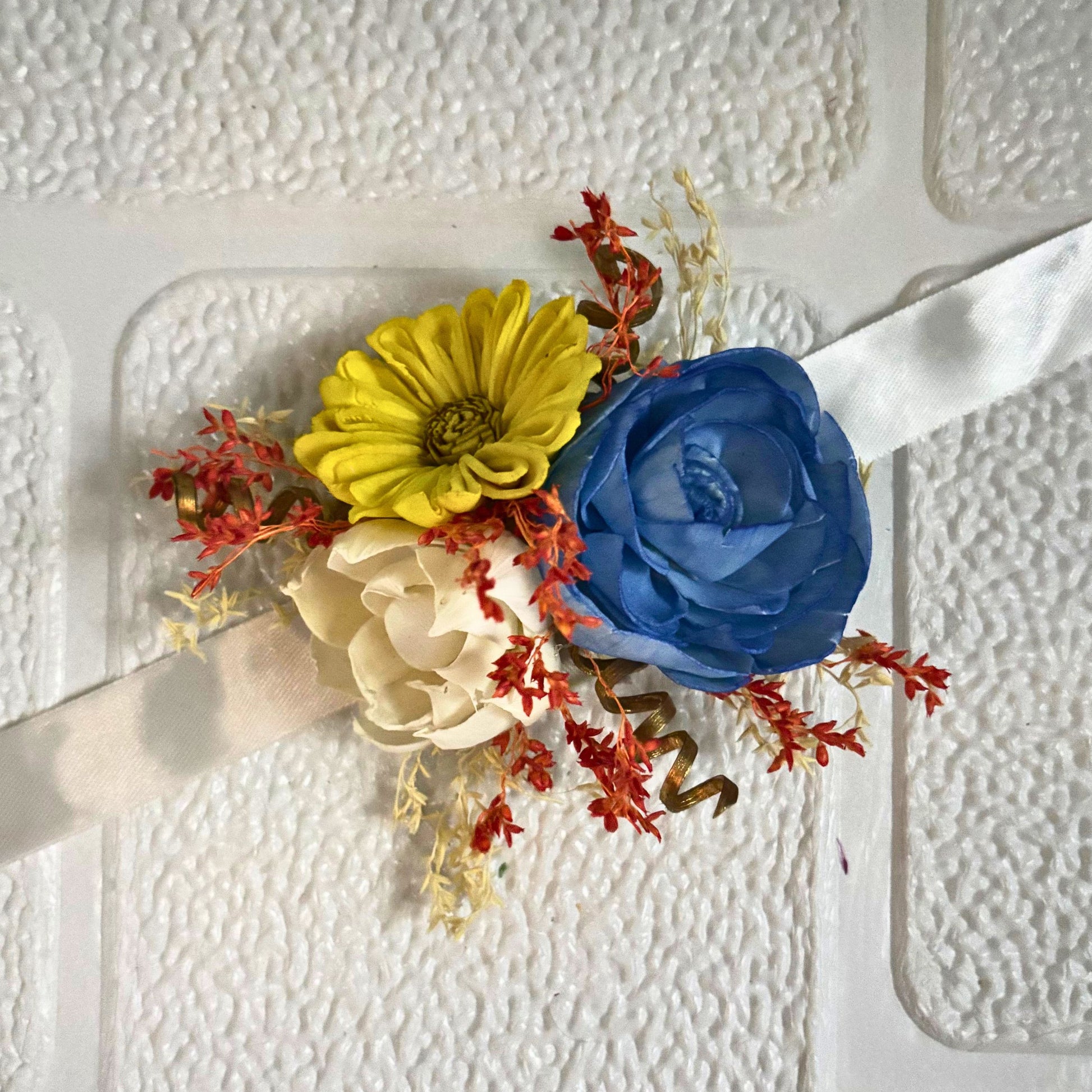 Beat the summer heat waves in style with this corsage. Handcrafted with sola wood flowers in the palette of a summer day along with dried botanicals, this eco friendly adornment is perfect for tropical themed parties or weddings or even for gifting. Have an understated influence with this corsage and add a cool piece of accessory to your wardrobe.