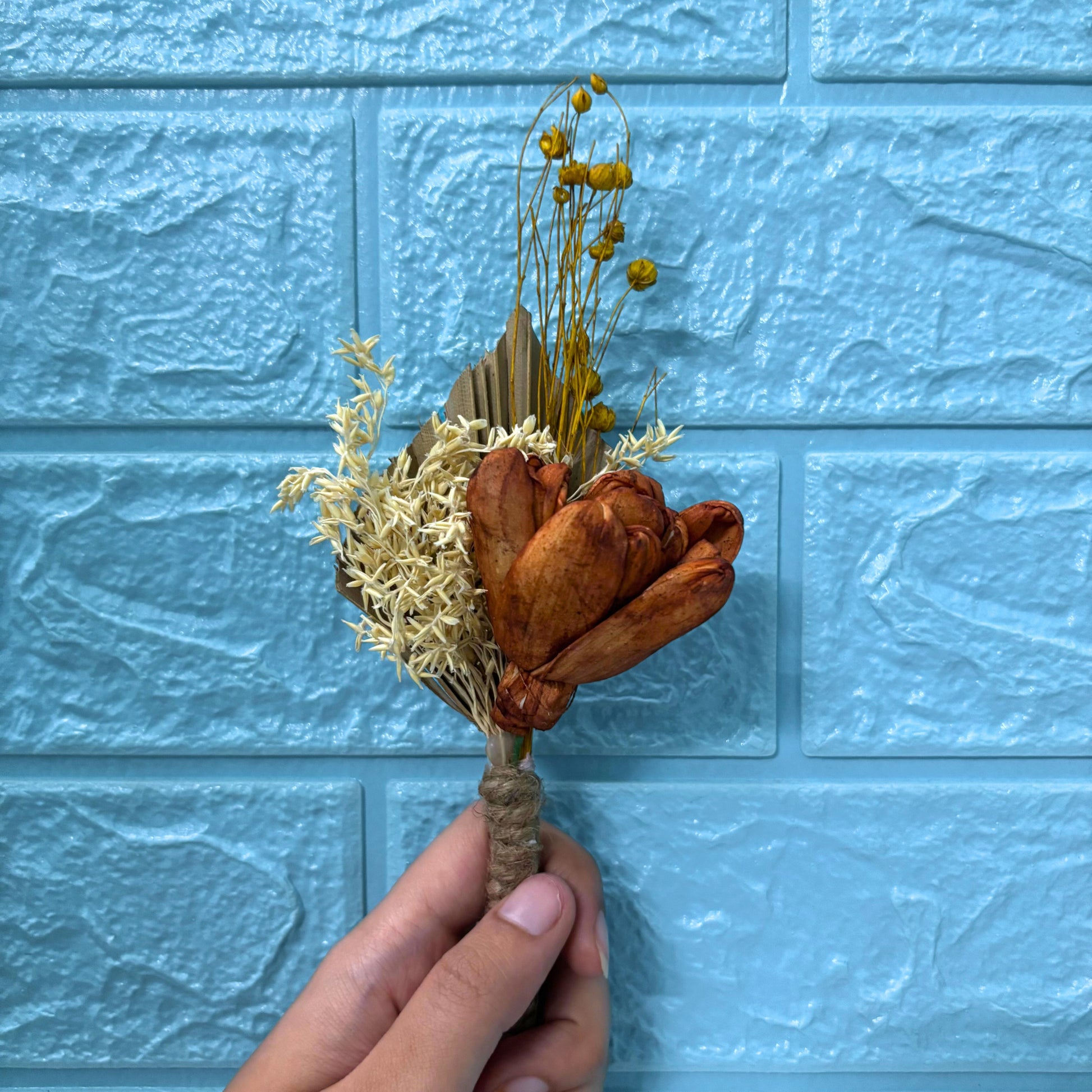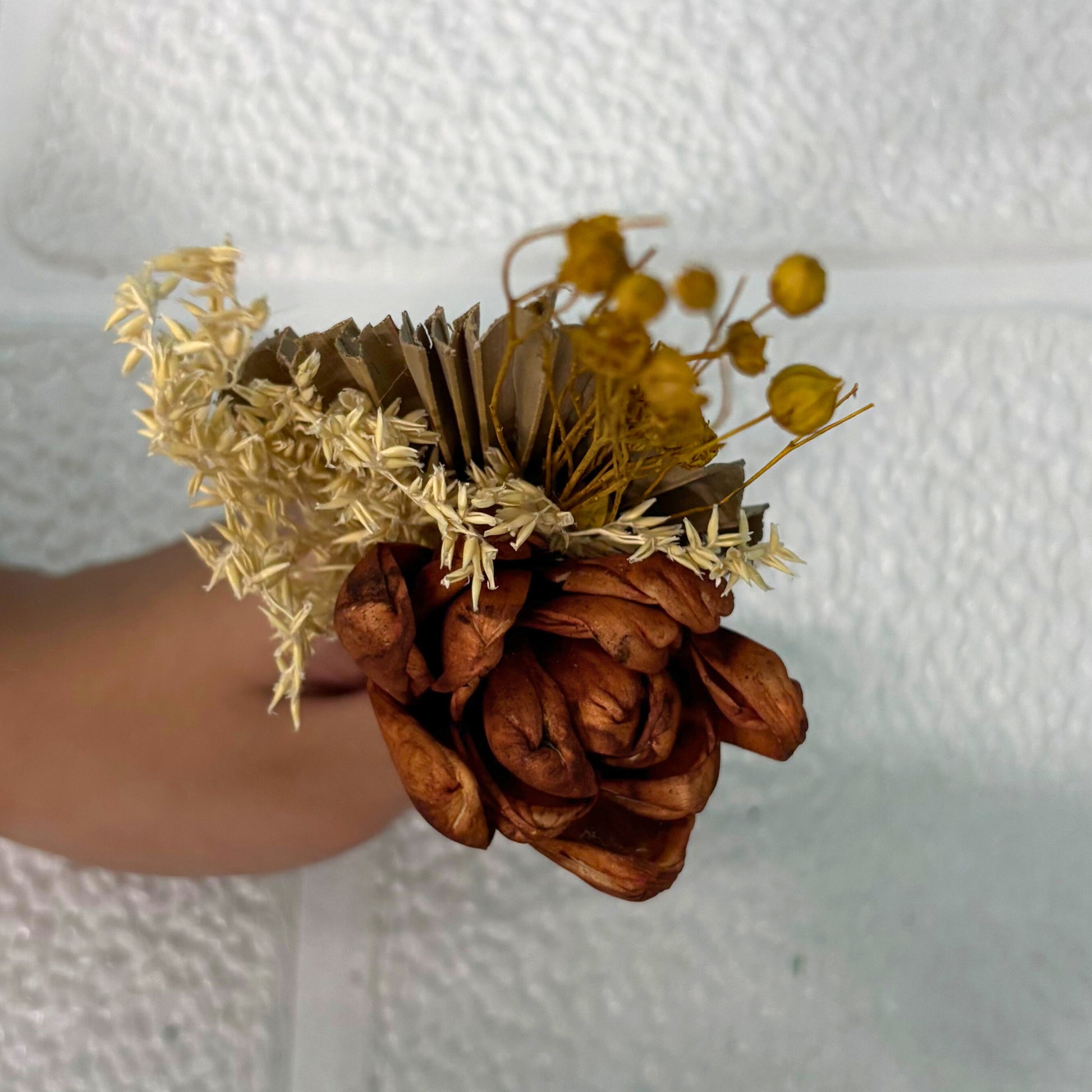 Embrace the grounded beauty of our 'Earthy Blooms' mini bouquet. This arrangement of a beautifully handcrafted brown sola wood flower, complemented by a medley of natural dried elements, offers a lasting connection to the natural world. Perfect for adding a cozy and organic feel to your decor or as a heartfelt, nature-inspired gift.