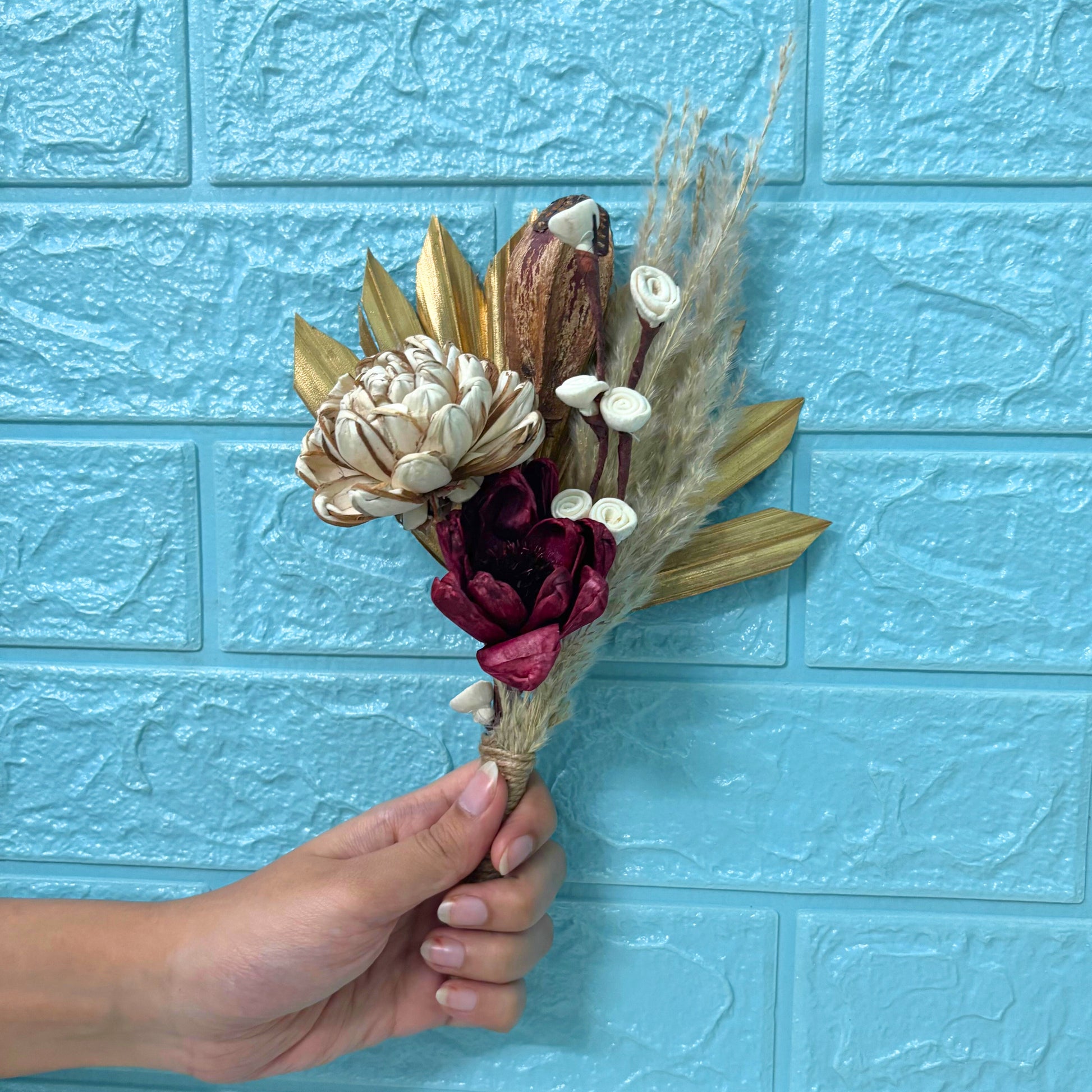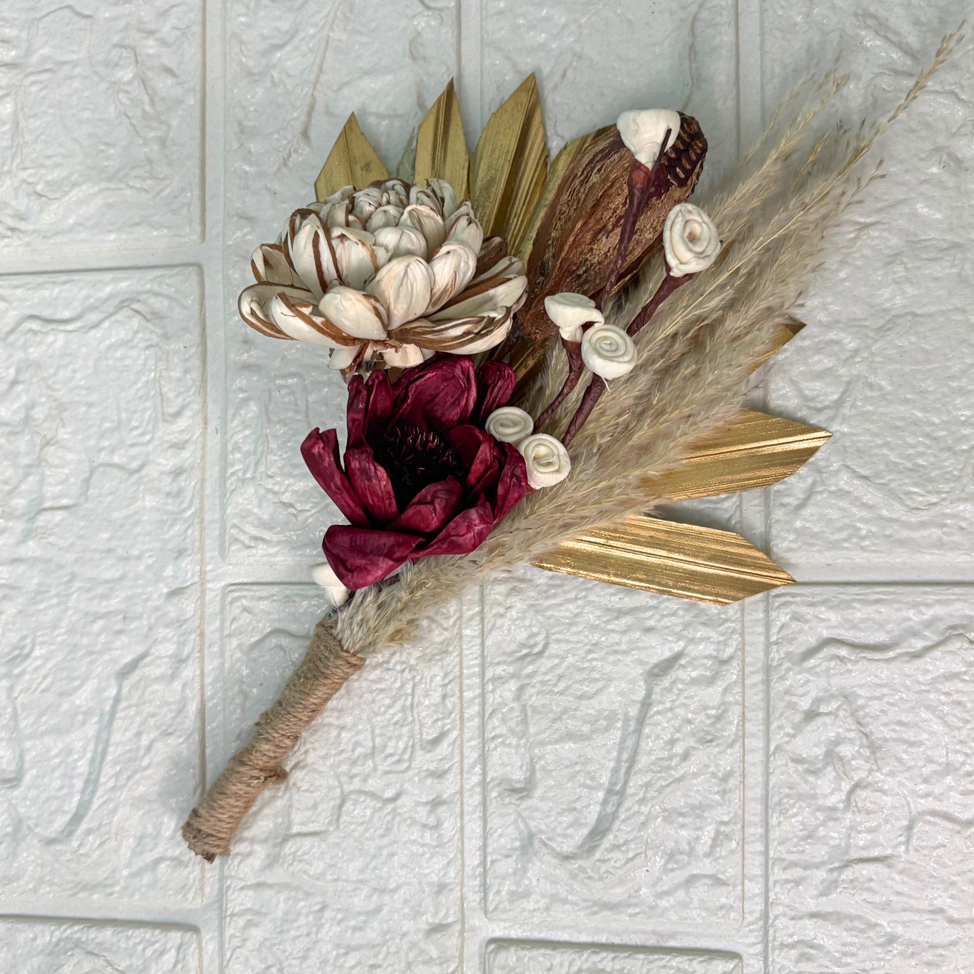 Enjoy this lasting treasure, where detailed craftsmanship of sola wood flowers meets the rustic beauty of natural dried botanicals. Not only does this bouquet add a touch of bohemian charm and sustainable elegance to any setting but also makes a thoughtful and enduring gift.