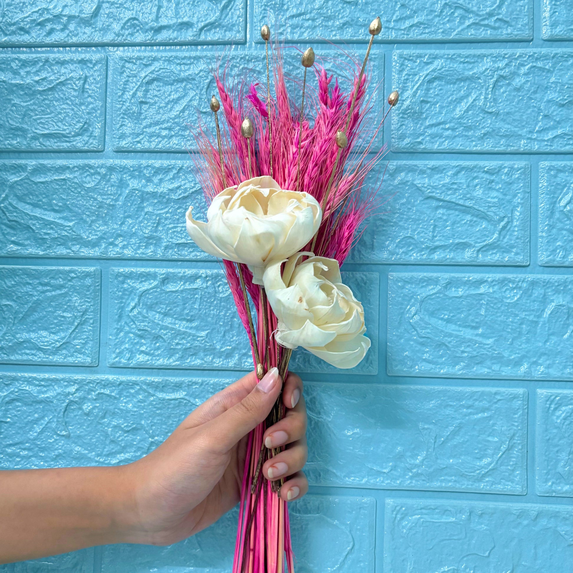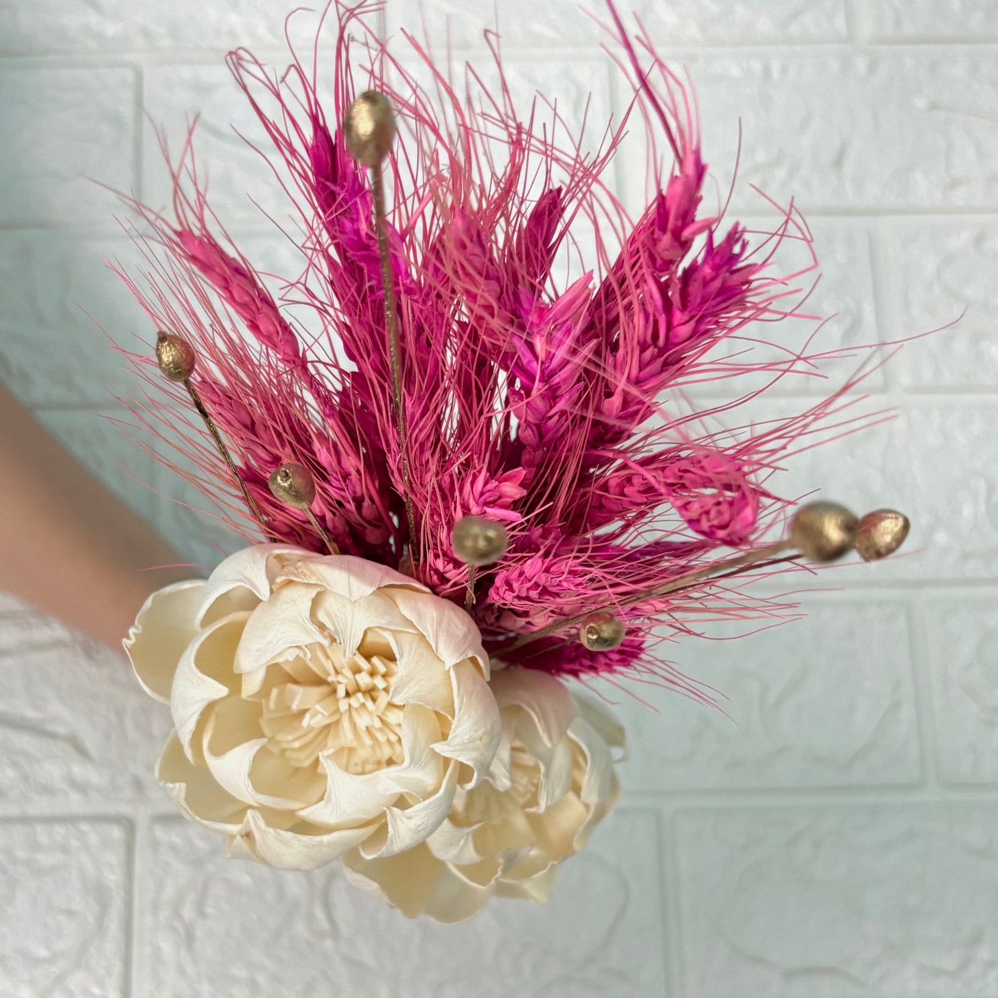 Embrace the timeless allure of our handcrafted bouquets showcasing delicate sola wood flowers, arranged artfully with natural dried botanicals. Offering enduring elegance and a sustainable alternative to fresh blooms, these are perfect for gifting or adding a lasting touch to your own decor.