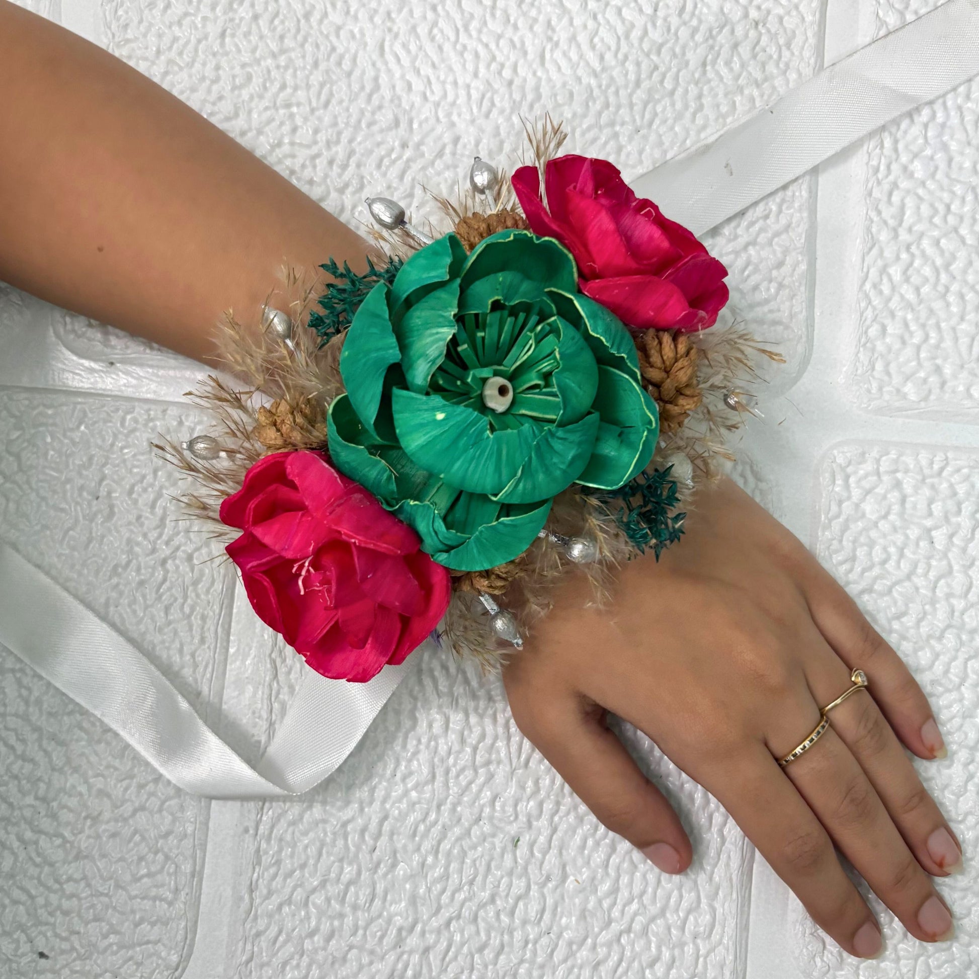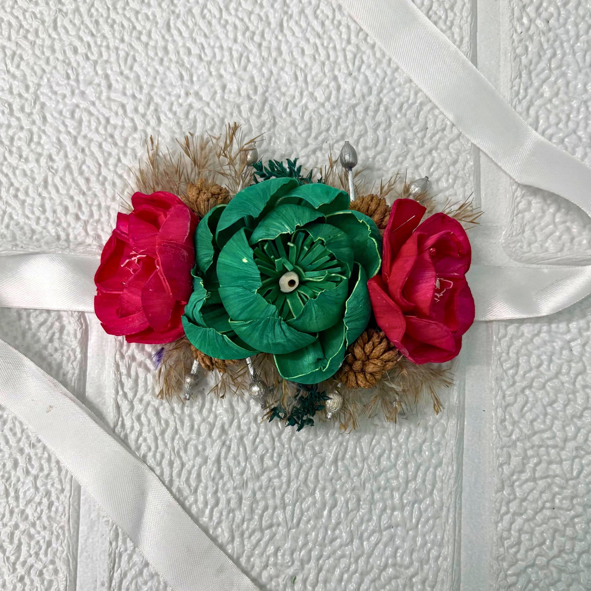 Add a touch of Bohemian Romance with this beautifully handcrafted corsage of sola wood flowers in green and red, paired with dried botanicals to create a visually stunning piece. Experience the captivating interplay of texture and color with this unique corsage and accessorize it on any occasion from wedding to prom parties to any festivity or even use it as a special gifting adornment.