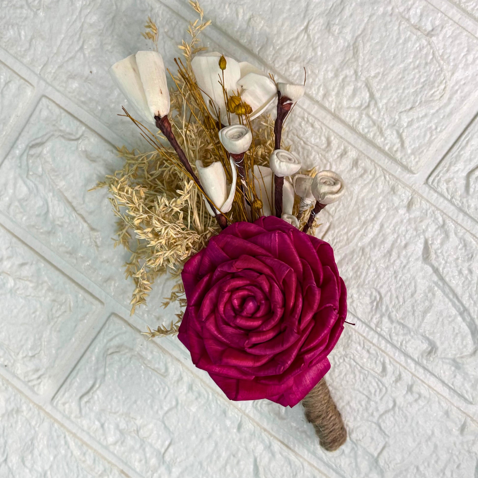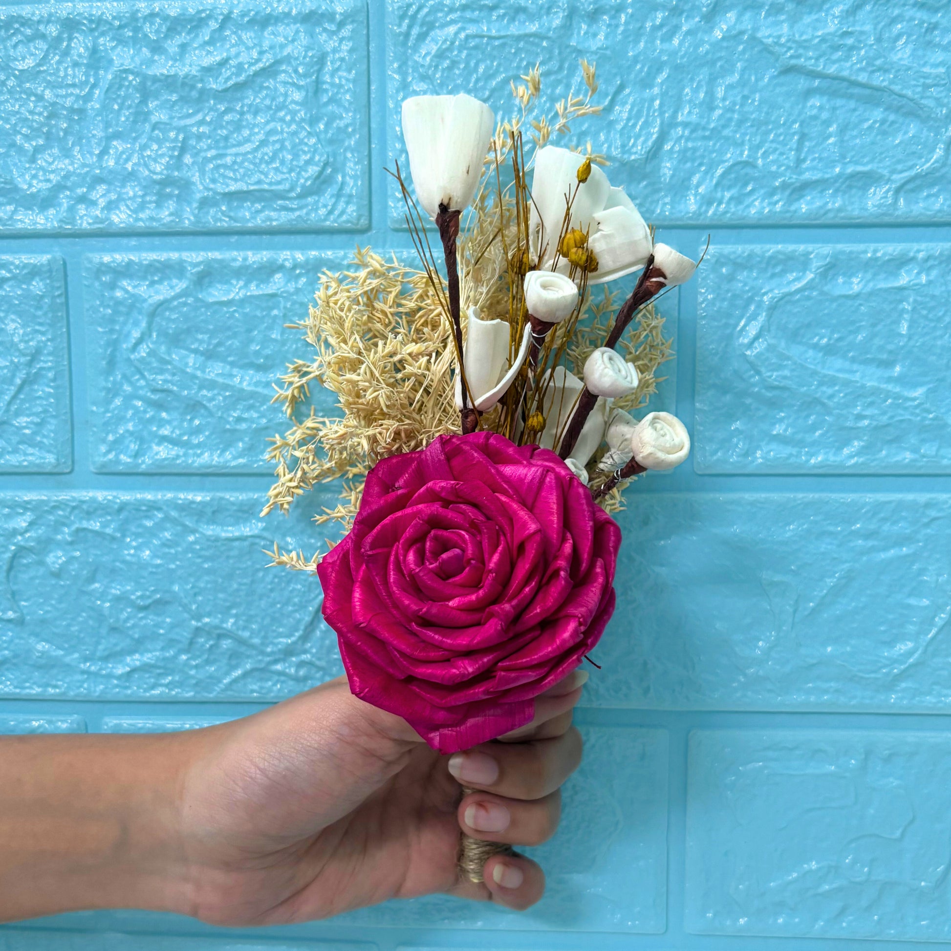 Introducing our 'The Rosy Rustics' mini bouquet - a testament to handcrafted charm that brings a touch of serene elegance to any corner. Pairing the sola wood flowers artfully with natural dried elements, this petite arrangement is perfect for minimalist decor or as a sweet, thoughtful gesture.