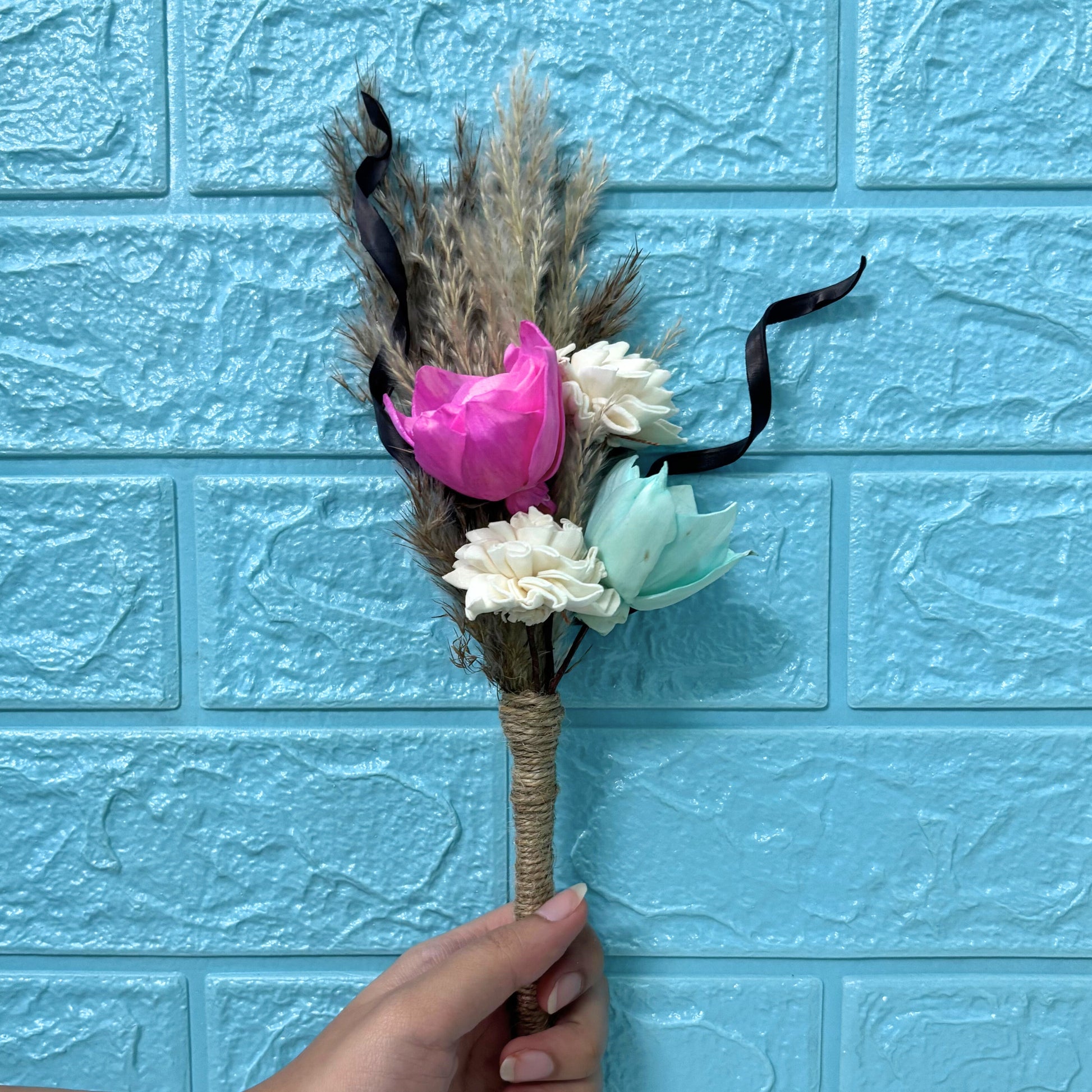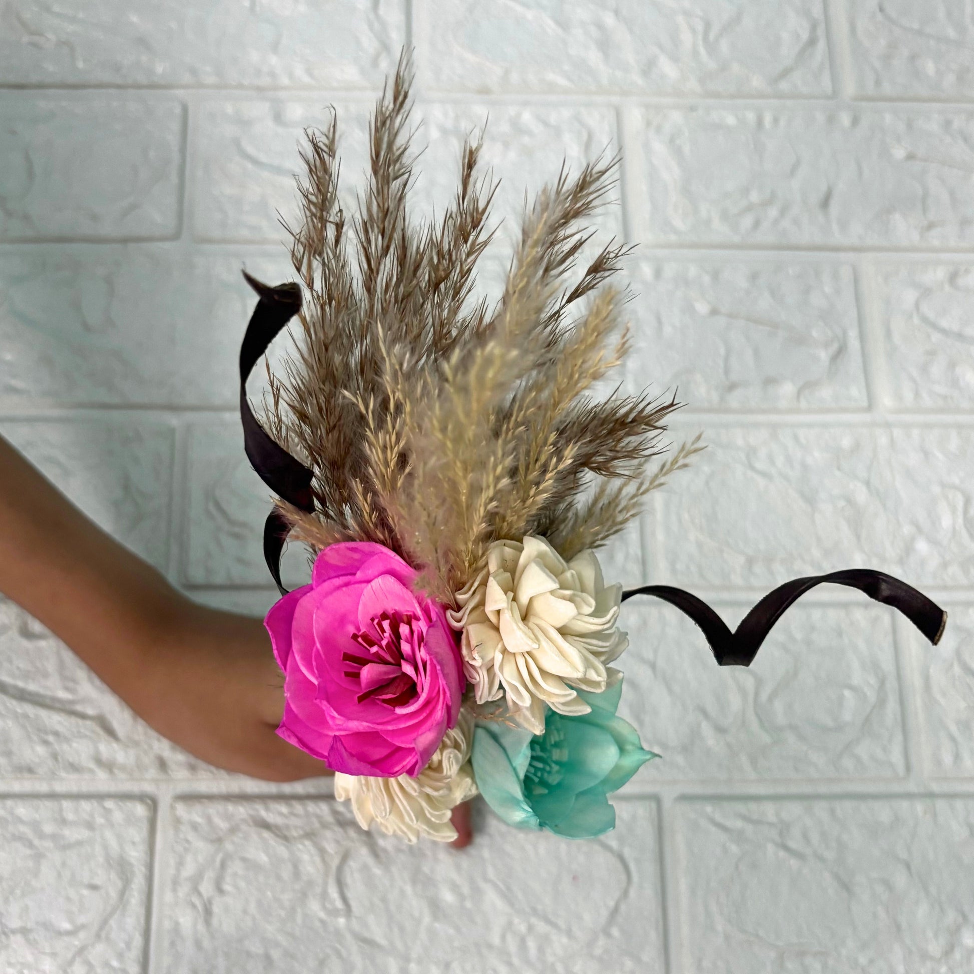 Featuring a delicate beauty where soft pink, serene blue and ivory blooms mingle beautifully with the earthy texture of natural dried botanicals. This small treasure brings a subtle touch of nature's artistry to any setting or as a heartful gesture.